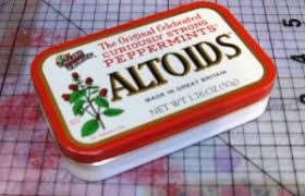 Altoids are mint candies that come in a cool little tin. (I actually do not like the candies, but that is neither here nor there). These tins are great for storing little items suchs at pins, tacks, beads etc. So I thought it would be fun to alter one. The measurements of the tin are: